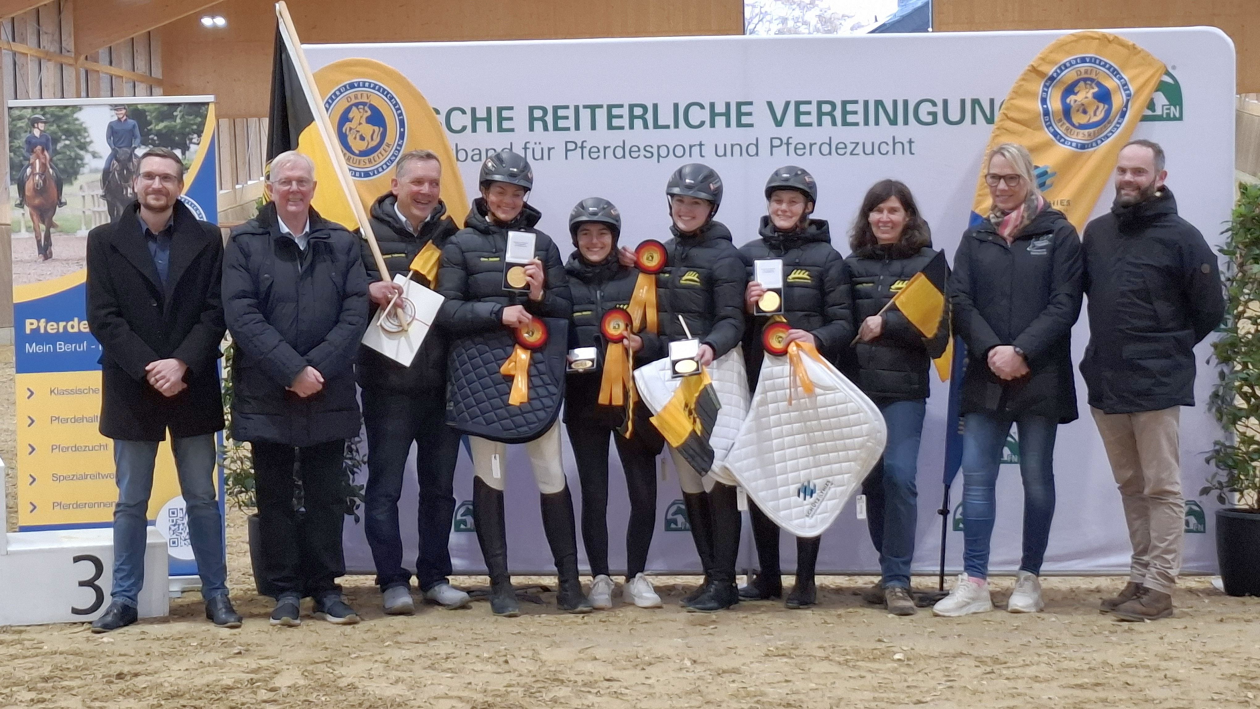 Die Landessiegerinnen des Landesentscheids aus Baden-Württemberg – Benita Bieler in der Klassischen Reitausbildung, Nina Barth in Pferdehaltung und Service, Angelina Hofer in der Pferdezucht – sowie die Zweitplatzierte Elisa Stößel in Pferdehaltung und Service, alle Auszubildende im Haupt- und Landgestüt Marbach, vertraten Anfang November ihr Bundesland in Warendorf. Die Mannschaft wurde von den Teamleitern Markus Lämmle, Leiter der Landesreitschule im Haupt- und Landgestüt Marbach, und Dr. Andrea Pfirrmann von der Beruflichen Schule Münsingen begleitet.